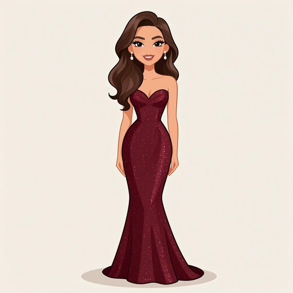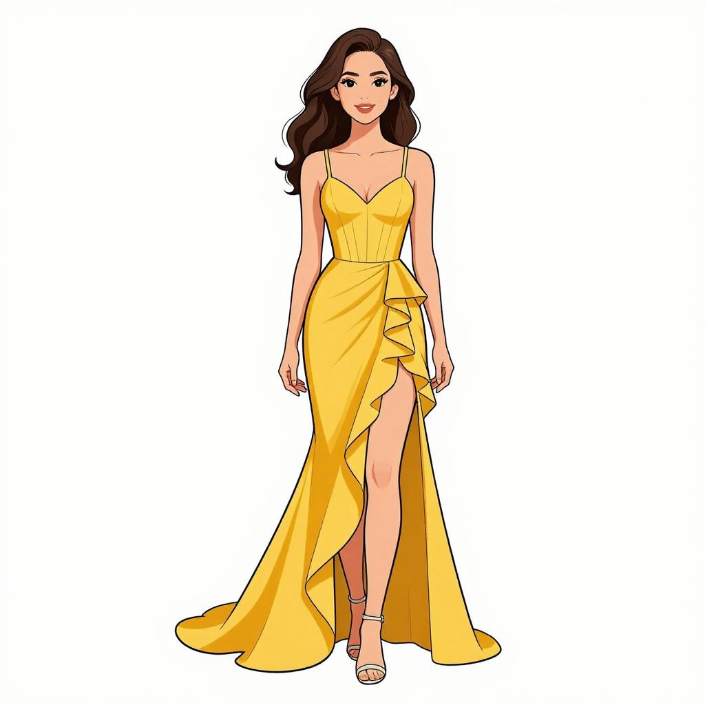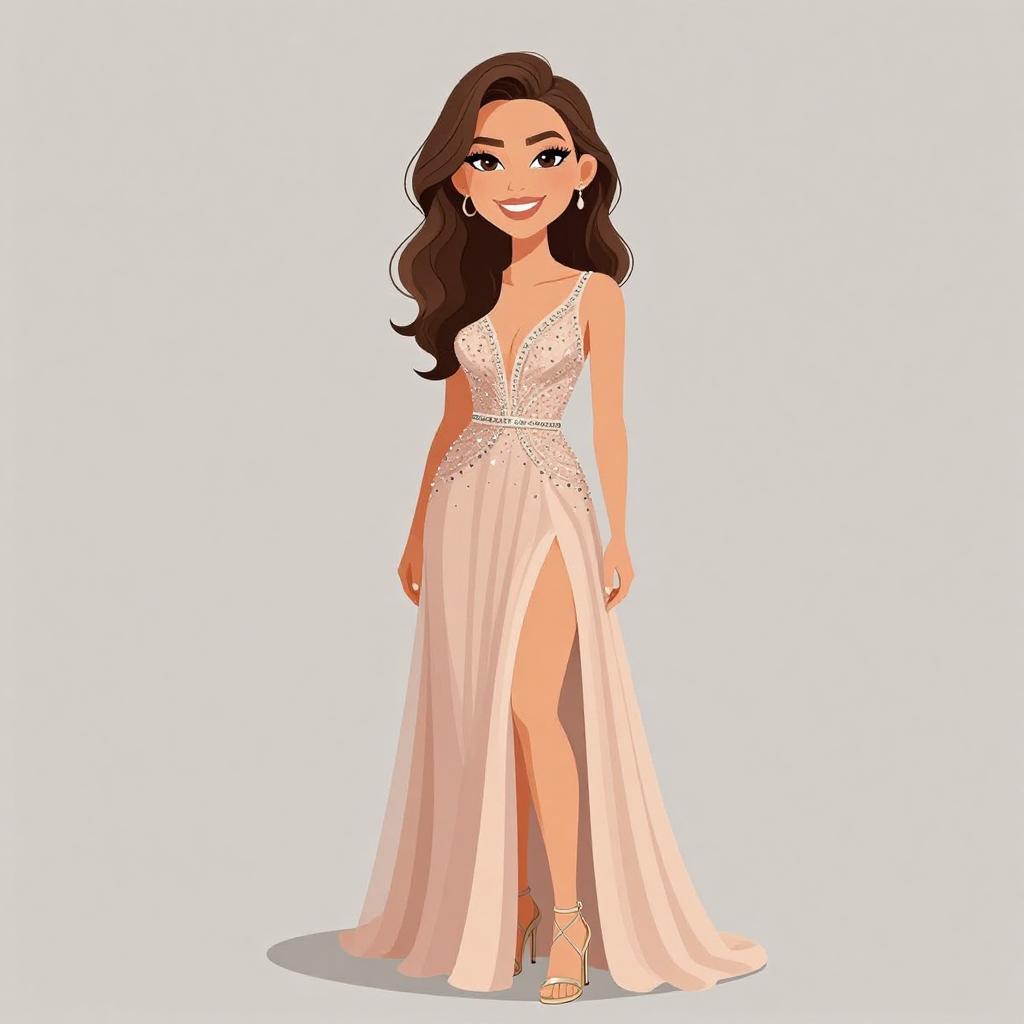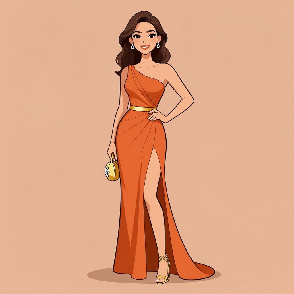 Woman with pretty face and pretty hair. smiling Woman, elegant evening wear, one-shoulder gown in burnt orange, diagonal pleated bodice, thigh-high slit, floor-length drape, slim waistband, delicate gold strappy heels, small gold clutch with shell-like embellishments, solid color background --sref 1467