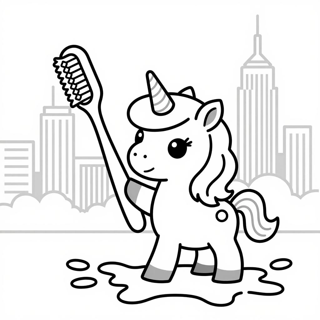 Toothbrush Splatter Coloring page for children, Lady Gaga into a cute unicorn standing in front of New york city, Walt Disney style, white background, with crisp lines, clean line art, black and white only, for a childrens coloring book,