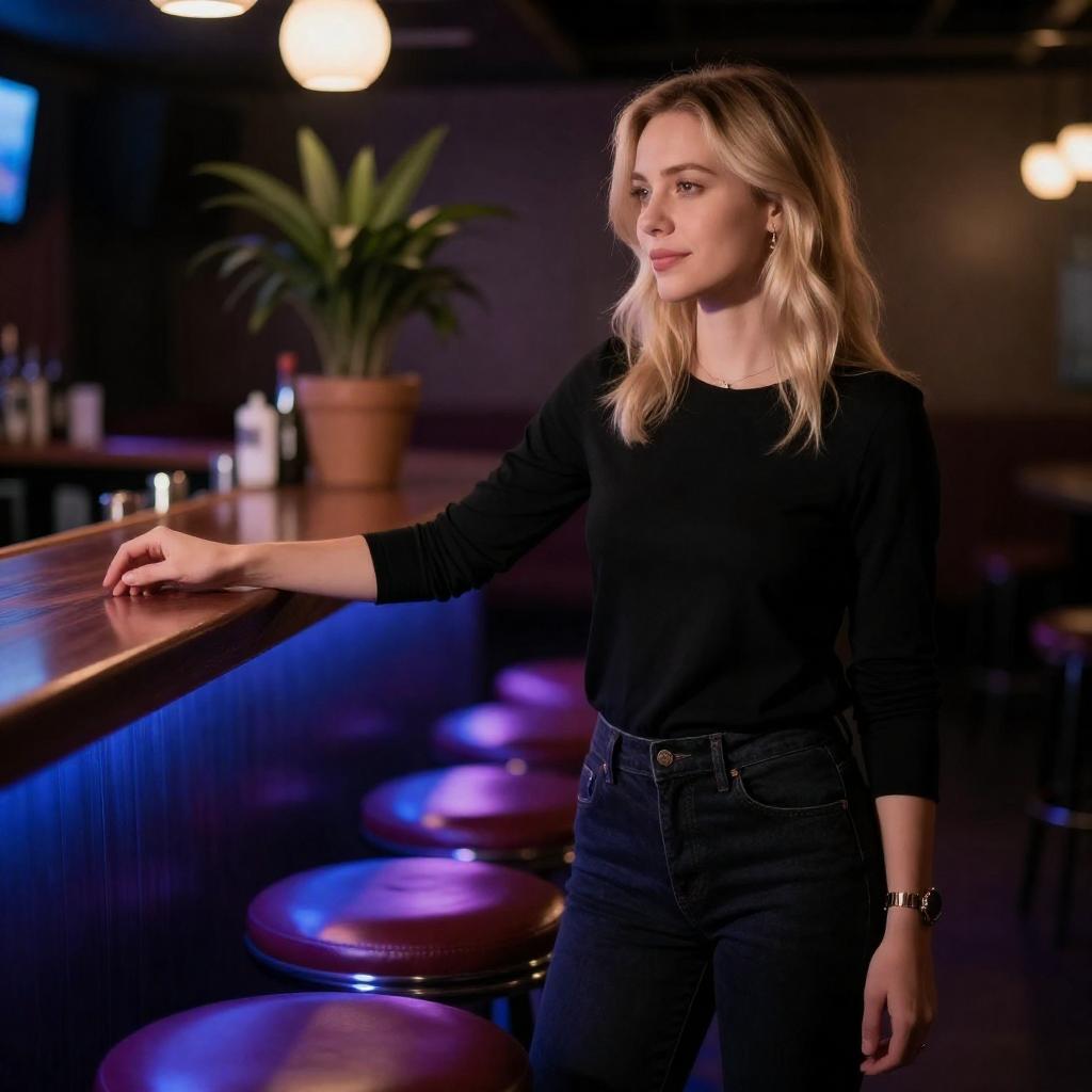 Photograph of a woman with short, blonde hair, wearing a blue denim dress with a white shirt underneath, standing in a dimly lit room. She looks over her shoulder with a serious expression, her right hand touching a dark wooden door. The background features a patterned, red and brown wallpaper.