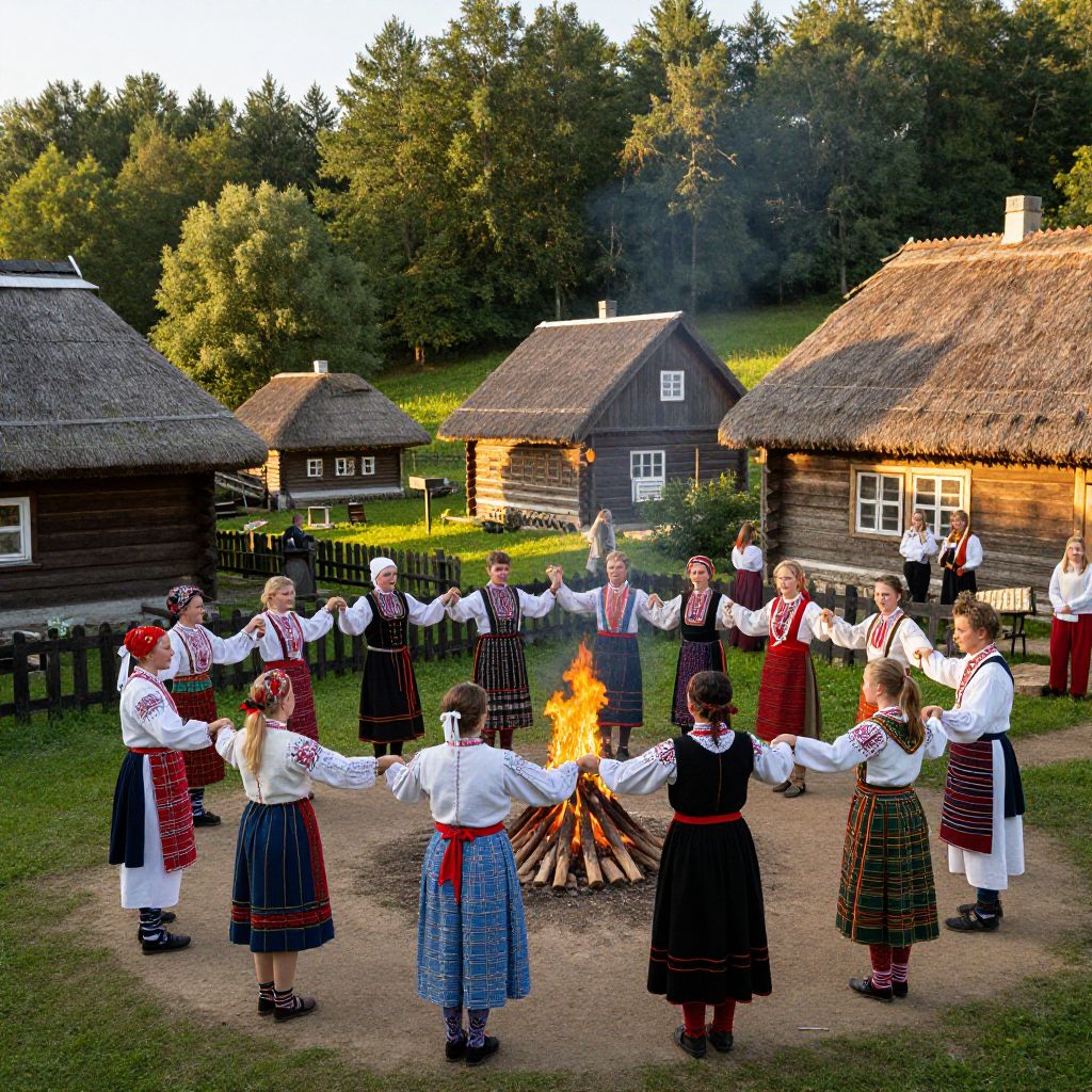 Lithuanian traditional village scene during golden hour, people in folk costumes dancing around a bonfire, wooden houses with thatched roofs, lush green forests in the background, detailed textures and warm natural lighting, cultural celebration ambiance.