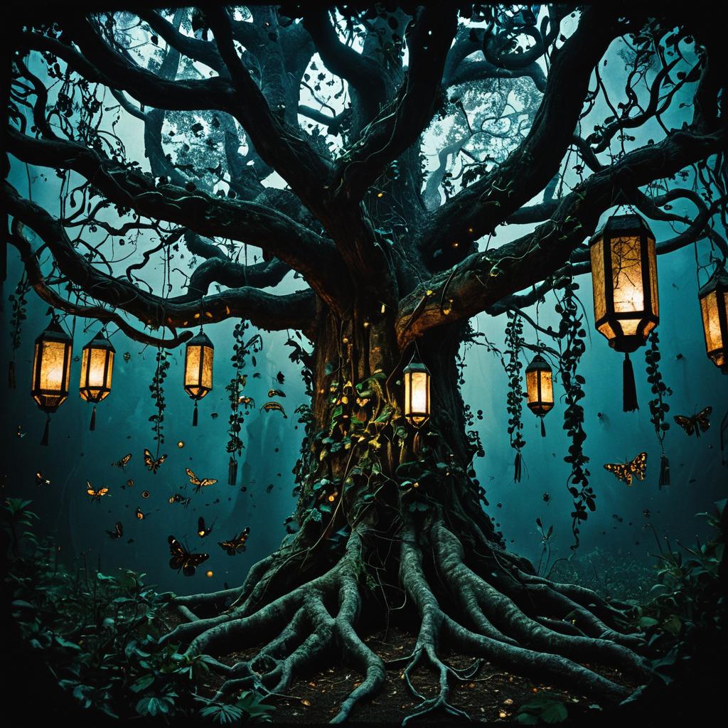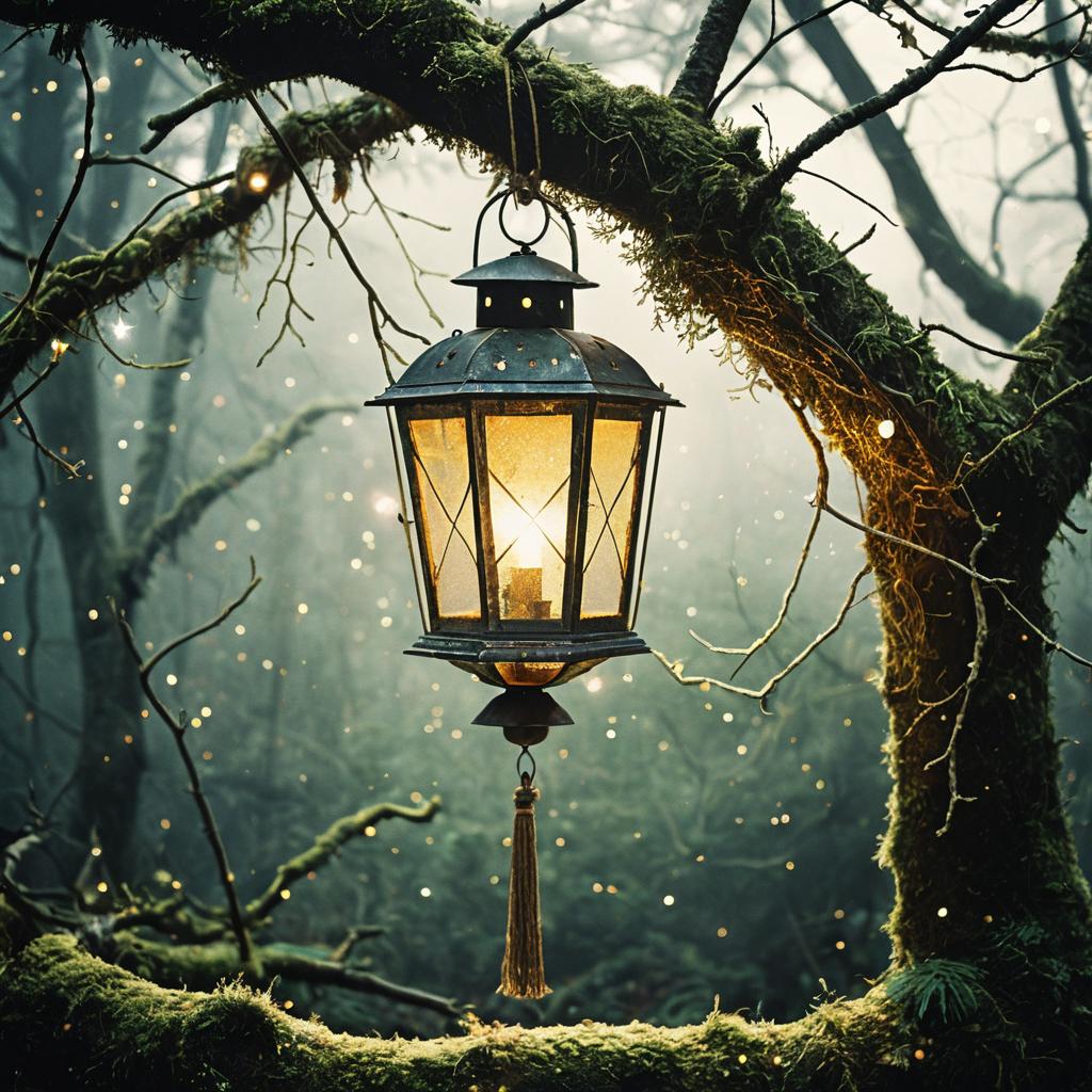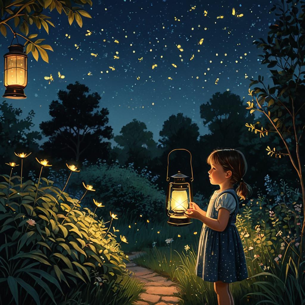 A lantern glowing with dancing fireflies, minimalistic, sleek.