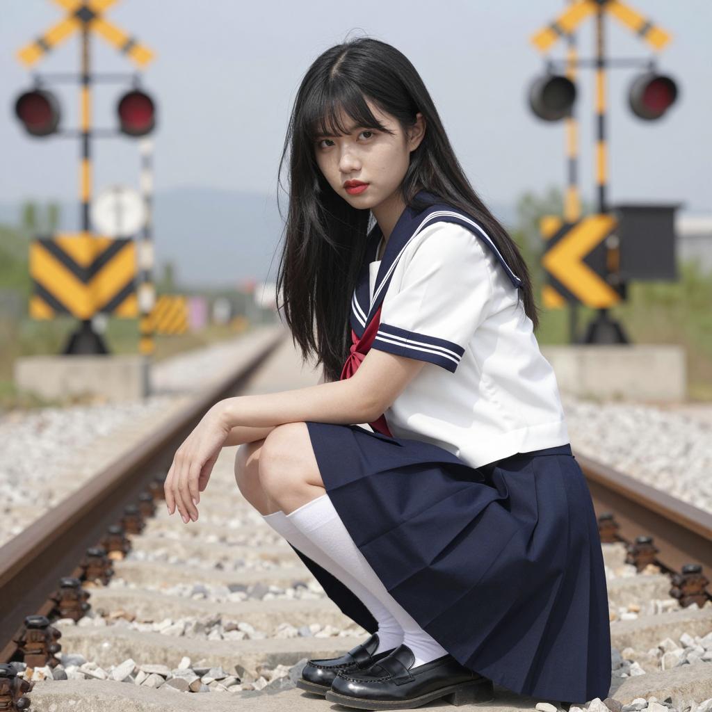 Young Asian woman with long black hair, standing on a wet train platform. She wears a white shirt, red necktie, black skirt, and knee-high socks. Looking up, slightly sideways. Blue mountains in the background. Overhead wires and a small round mirror on the left. Train tracks on the right. Water on the platform. Foggy atmosphere. Number "2" signpost on the left. Text "CKS JAPAN" in white on the platform.