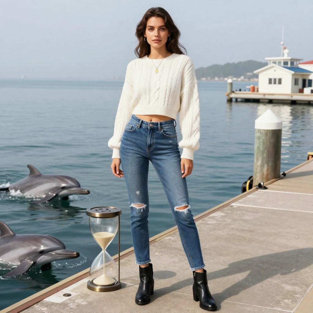 A Hourglass woman in a cropped white cable knit sweater and distressed blue skinny jeans stands on a fishing pier with dolphins, exuding a casual chic vibe. She wears black ankle boots with a low heel and a delicate gold pendant necklace, complemented by natural makeup and flowing hair. The scene is illustrated in the visual style of hakusensha. Sexy