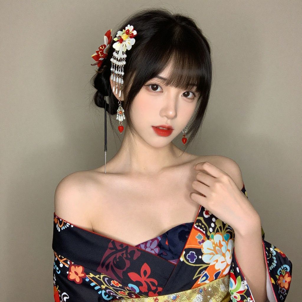 "chitenge tops costume, 1girl, solo, black hair, hair ornament, earrings, jewelry, flower, standing, realistic, chinese clothes, asian, hair flower, japanese clothes, red lips, kimono Realistic photo of casual sexy person with pretty face"
