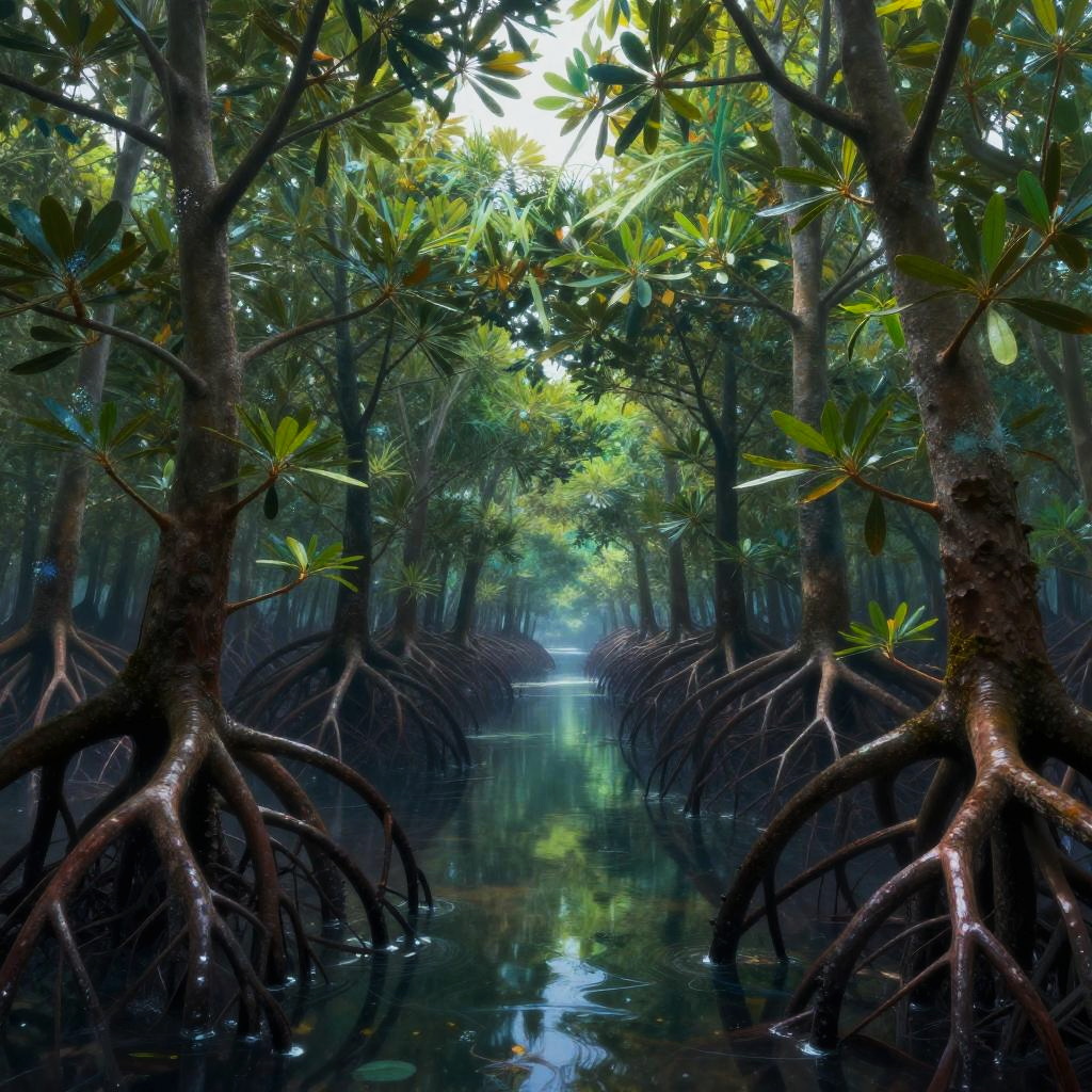 Bioluminescent submerged jungle, highly detailed, magical fantasy, neon colors, keyframe illustration, trending on artstation, in the style of Andreas Rocha, Albert Bierstadt