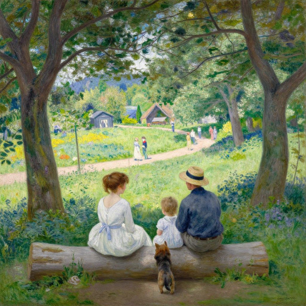 Illustration of a Victorian-era family sitting on a log under trees, watching a sunlit park with people and dogs. Woman in white dress, man