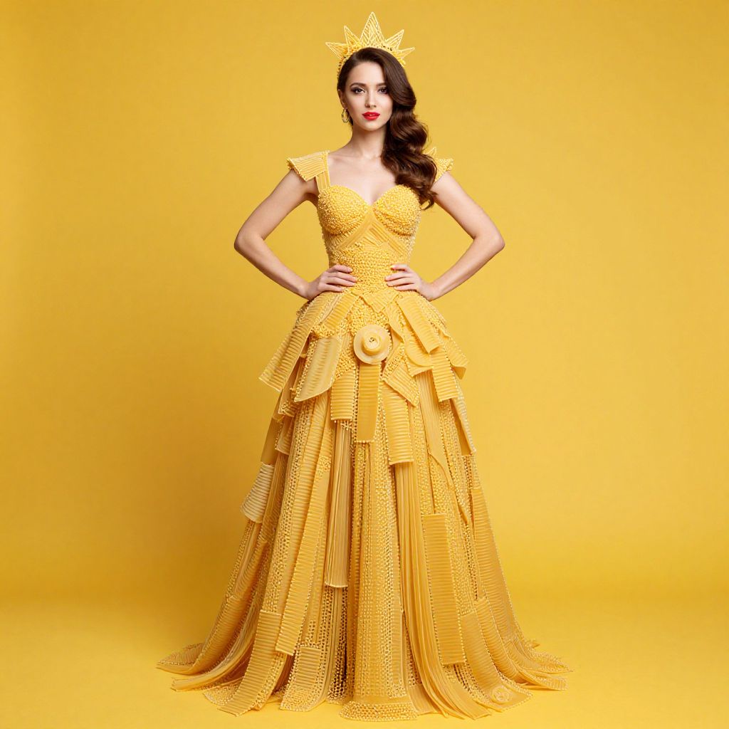 Photograph of a confident woman in a golden, ruffled, floor-length dress with intricate beadwork, wearing a crown, against a solid yellow background