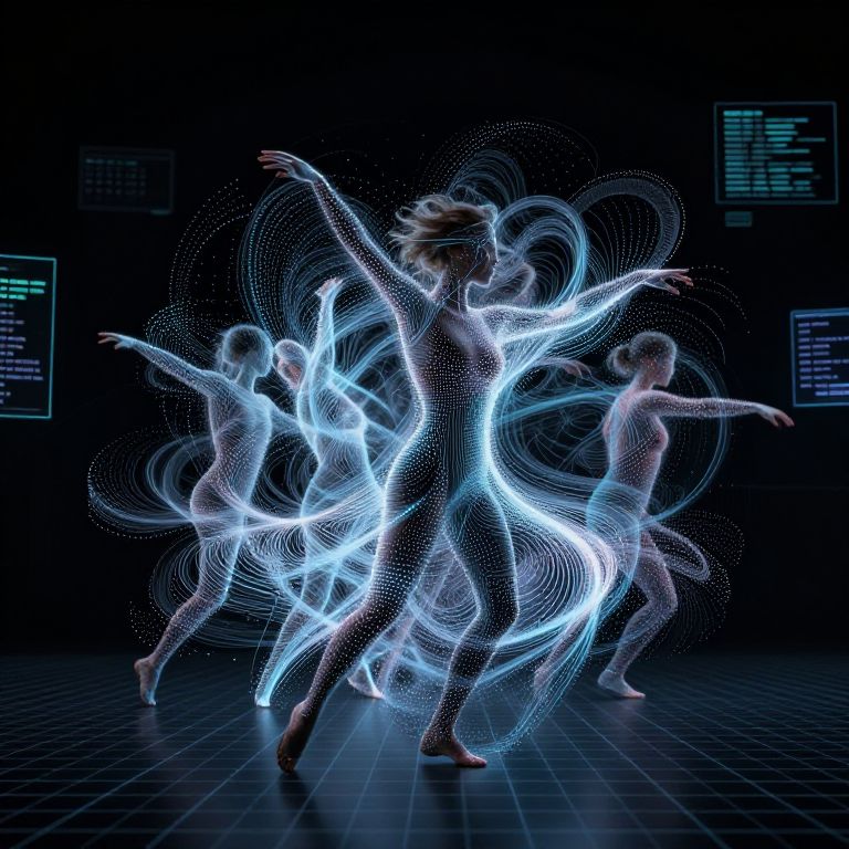 Dance Diffusion AI visualizing a captivating choreography with swirling particle effects and digital patterns, dancers intertwined with abstract data streams, set against a dark background filled with pulsing light grids and hologram interfaces, evoking a cybernetic dance experience.