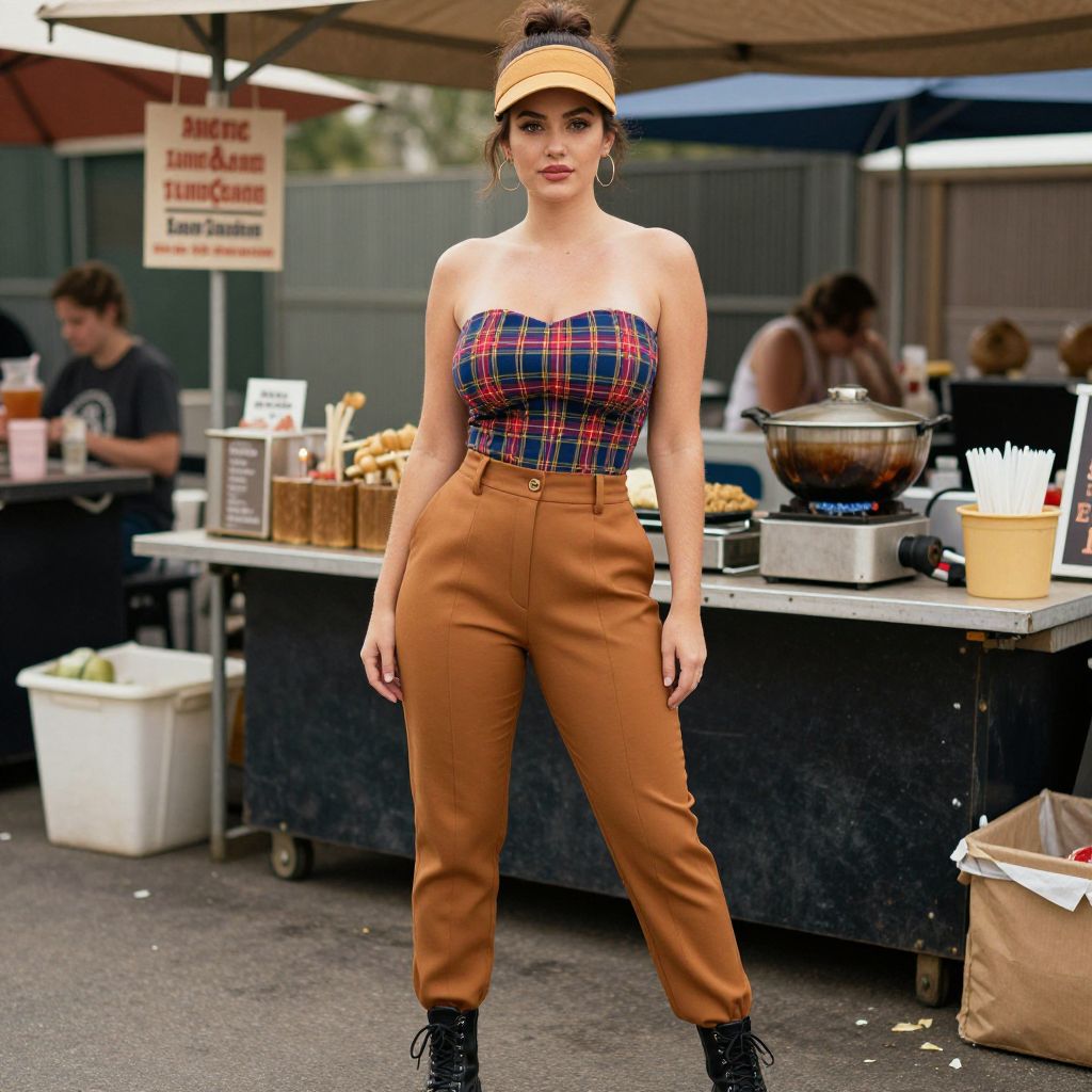 A woman in an ib technicolor film stock style, wearing a plaid bandeau top in red, blue, and yellow, high-waisted caramel trousers, and black chunky lace-up boots, stands at a street food market stall. She accessorizes with a caramel visor hat and thin hoop earrings. Sexy. Pretty face and beаutiful eyes. Big breasts.