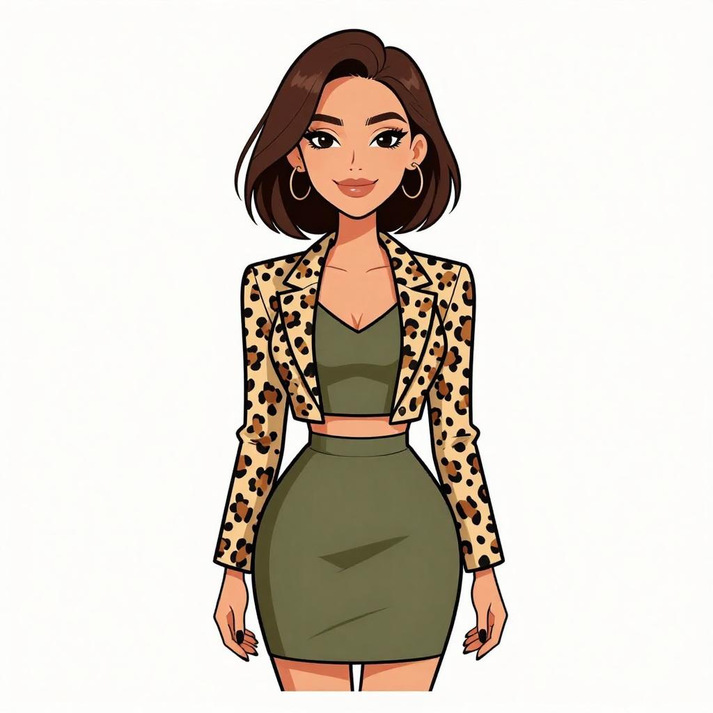 Woman with pretty face and pretty hair. smiling Woman, minimalist chic, olive green halterneck romper, sleeveless, high neckline, fitted waist, pleated shorts, straight hem, hoop earrings, hair in a low ponytail, plain white studio background --sref 1467