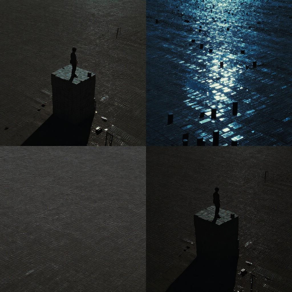 This image is a photograph split into four quadrants, showcasing a vast, grid-like arrangement of small, rectangular objects. In the top-left quadrant, a person with short hair stands on top of a tall, rectangular stack of these objects. The other three quadrants display different angles of the same grid-like pattern, with the top-right quadrant showing a bright blue light reflecting off the objects, creating a shimmering effect. The bottom quadrants show darker, more muted colors with less light reflection. The overall scene is abstract and somewhat futuristic.