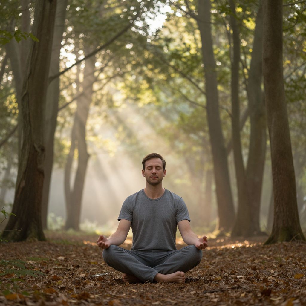 Gelassener man meditating peacefully in a serene forest, soft sunlight filtering through tall trees, gentle mist around, tranquil atmosphere, harmonious nature scene, warm tones, realistic style, detailed textures, calming and soothing mood.