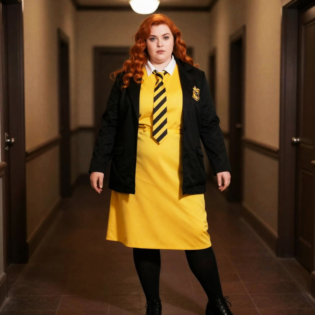 Hufflepuff Costume Plus Size, dressed in a yellow dress and black jacket standing in a hallway