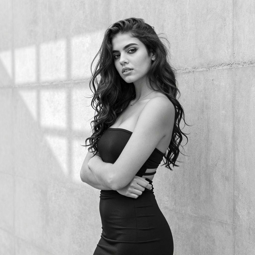 Portrait of a young woman with long wavy brown hair and light brown skin sitting on a window ledge. She is wearing a black dress with white polka dots and thin straps. The woman accessorizes with a silver necklace, a ring on her right hand, and a bracelet on her left wrist. She poses with her right hand touching her face and her left hand resting on her hip. The background includes a wooden cabinet and a reflective glass window.