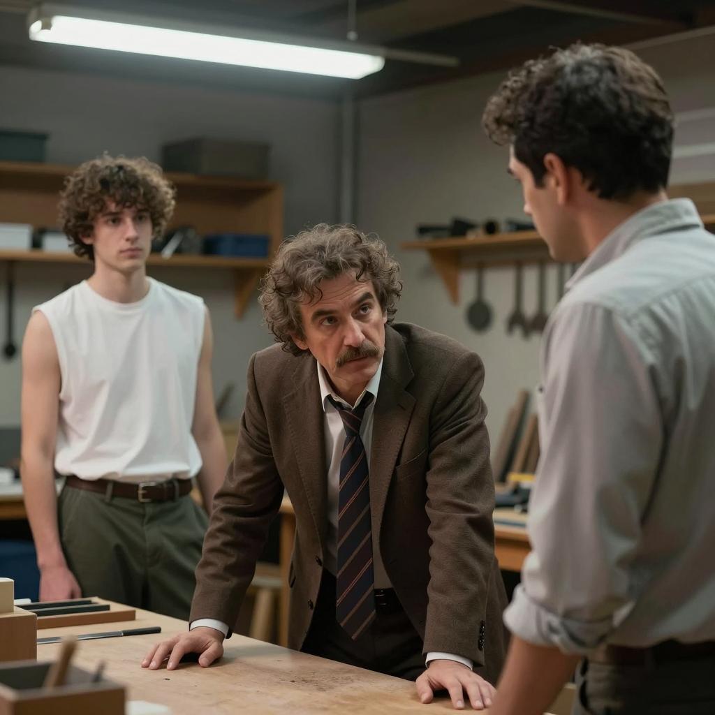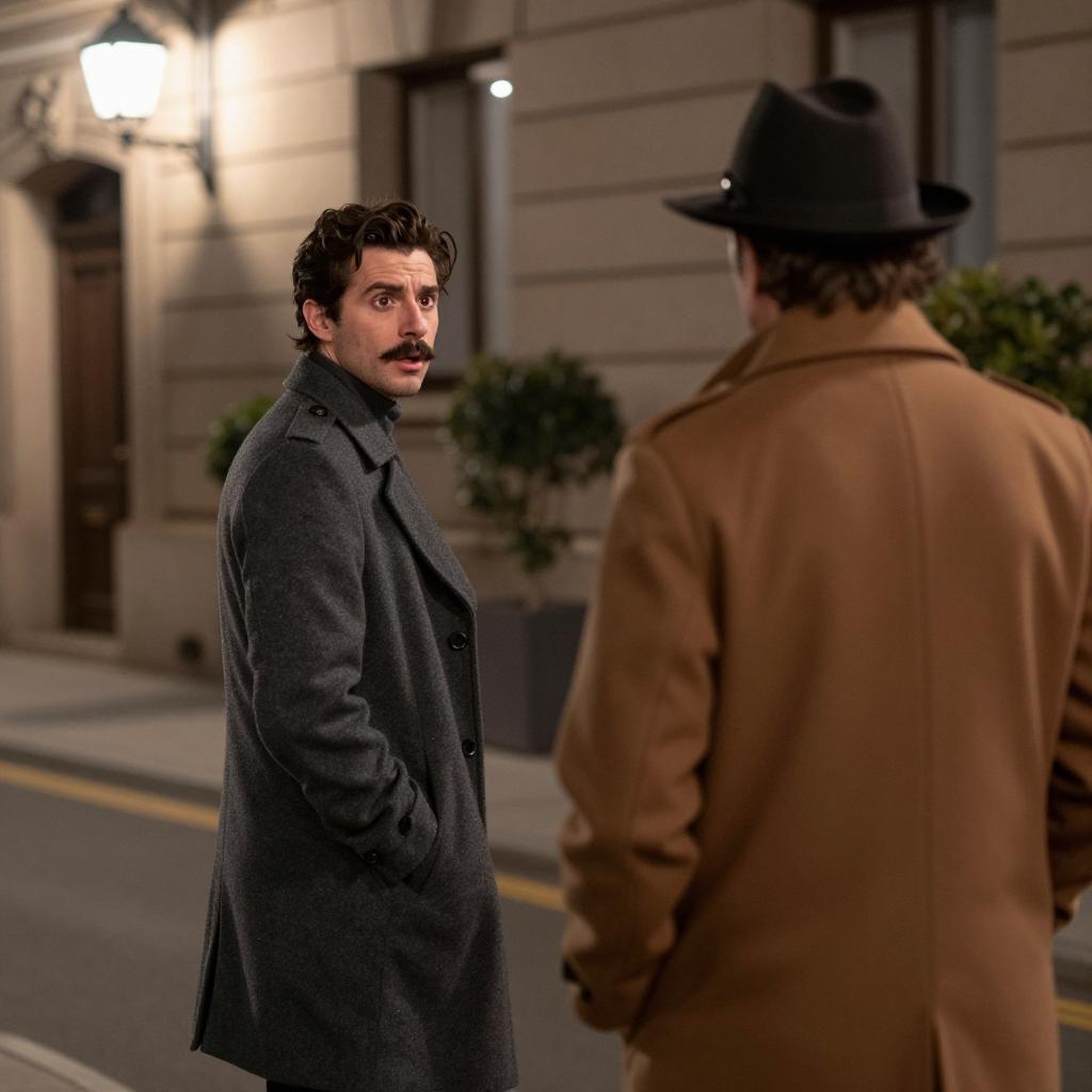 Three men in a dimly lit room. Middle man with curly brown hair, mustache, wearing a light blue sleeveless shirt, stands between two men. Left man in dark suit and hat, right man in brown coat, both partially shadowed. Lamp with glowing light on left. Patterned curtains in background.