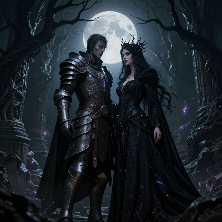 Dark fantasy couple art depicting a mysterious warrior and an enchanting sorceress cloaked in shadows, illuminated by eerie moonlight, surrounded by ancient ruins and twisted trees, with intricate gothic armor and ethereal magic swirling around them.