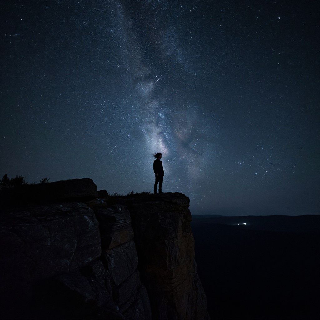 Majestic landscape, deep into the night, stars twinkling above, comets streaking across the celestial canvas, a lone figure stands atop rugged cliffside, silhouette against the ethereal glow, wind-blown hair, contemplative gaze, vast expanse of darkness below, infinite mystery unfolding. Man has masculine face and piercing eyes