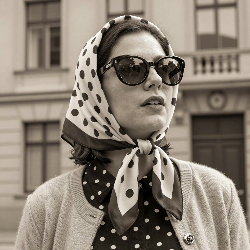 Photograph of a woman with dark hair in a bun, wearing a polka dot headscarf tied with a bow, large round sunglasses, a black polka dot blouse, and a ured cardigan with a brooch. She looks upward with slightly open mouth. Background shows a blurred building with windows and a sign. Monochromatic sepia tone. Woman in front, building in background.