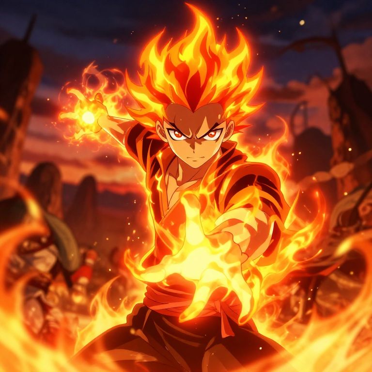 Fire anime boy with flame-shaped hair and a burning aura, casting powerful fire magic from his hands, intense expression, surrounded by a burning battlefield at dusk, intricate anime illustration with sharp contrasts and glowing effects.