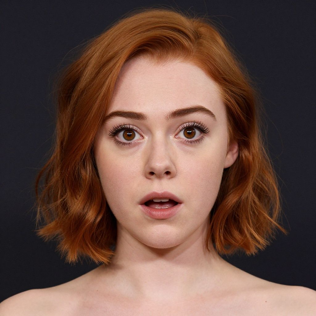 Photograph of a young Caucasian woman with fair skin and vibrant red, shoulder-length, wavy hair. She has large, brown, expressive eyes with long eyelashes, and slightly parted pink lips. Her eyebrows are neatly shaped, and she has a few freckles on her cheeks. The background is a solid, dark blue, making her face stand out prominently. The lighting is even, highlighting her natural features and clear complexion. She appears to be topless, with no visible clothing in the frame. The image has a realistic, high-definition quality, focusing closely on her face.