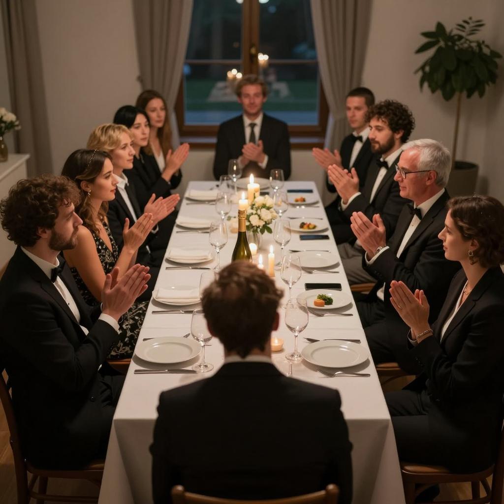 Indoor scene featuring a man and a child walking up a marble curved staircase adorned with golden string lights and intricate iron railings beside a white angel statue. A decorated Christmas tree with colorful ornaments and lights stands on the left. On the right, four adults in formal attire are seated around a round table with white tablecloth, set for dining, in a warmly lit sophisticated environment.