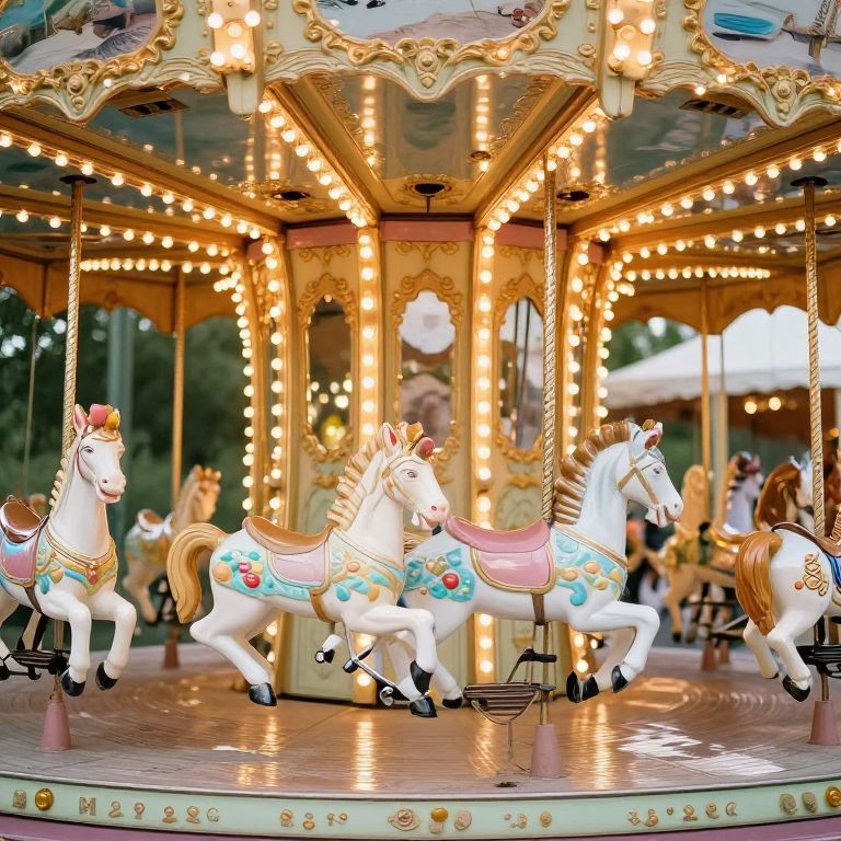 Photograph of a vintage carousel with brightly lit, ornate, white horses adorned with colorful decorations, set against a glowing, golden framework.
