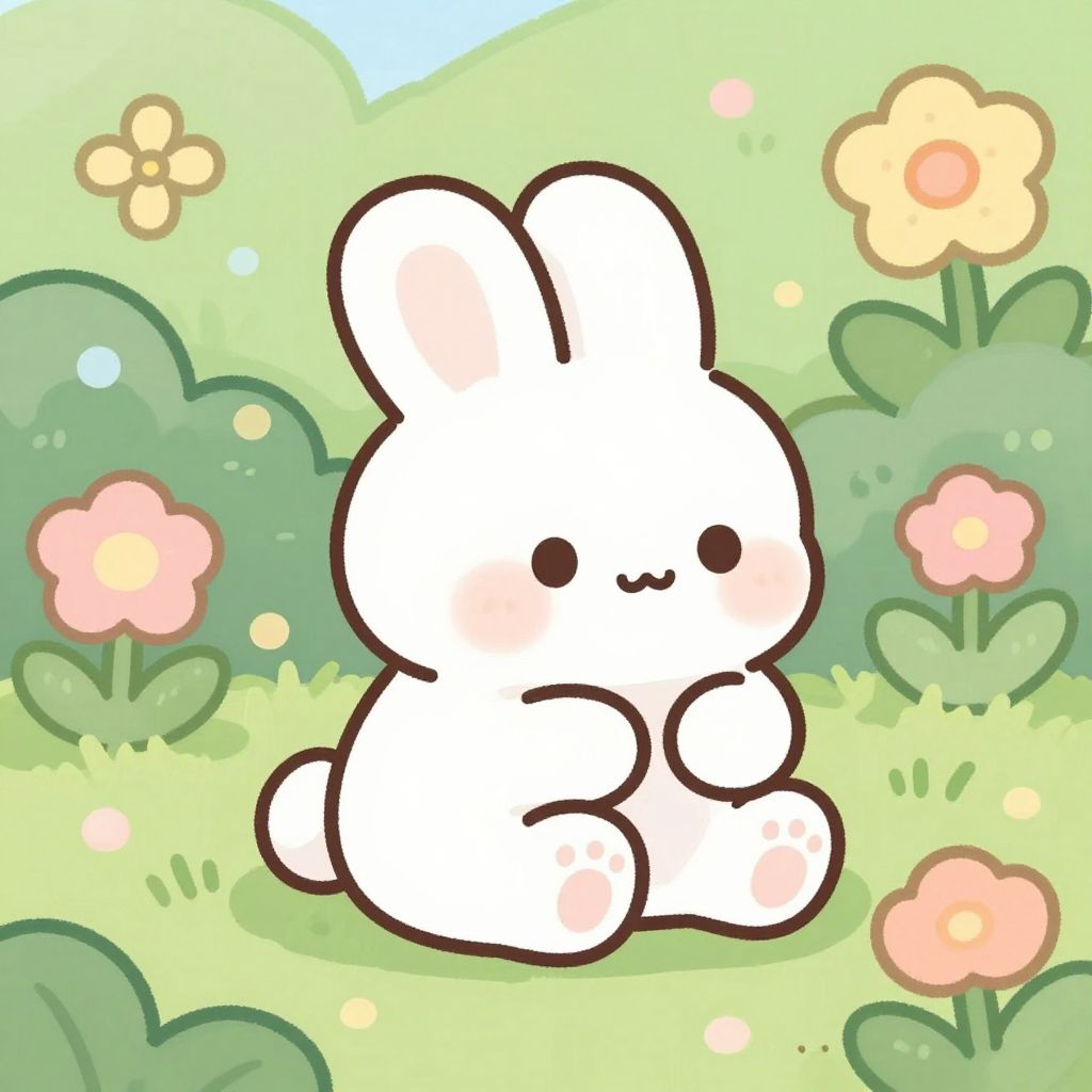 A charming cartoon-style illustration of a baby white rabbit with pink accents, sitting amidst a whimsical garden filled with pastel-colored flowers, lush green leaves, and tall grass. The image features bold outlines and soft pastel coloring for a playful and enchanting look.
