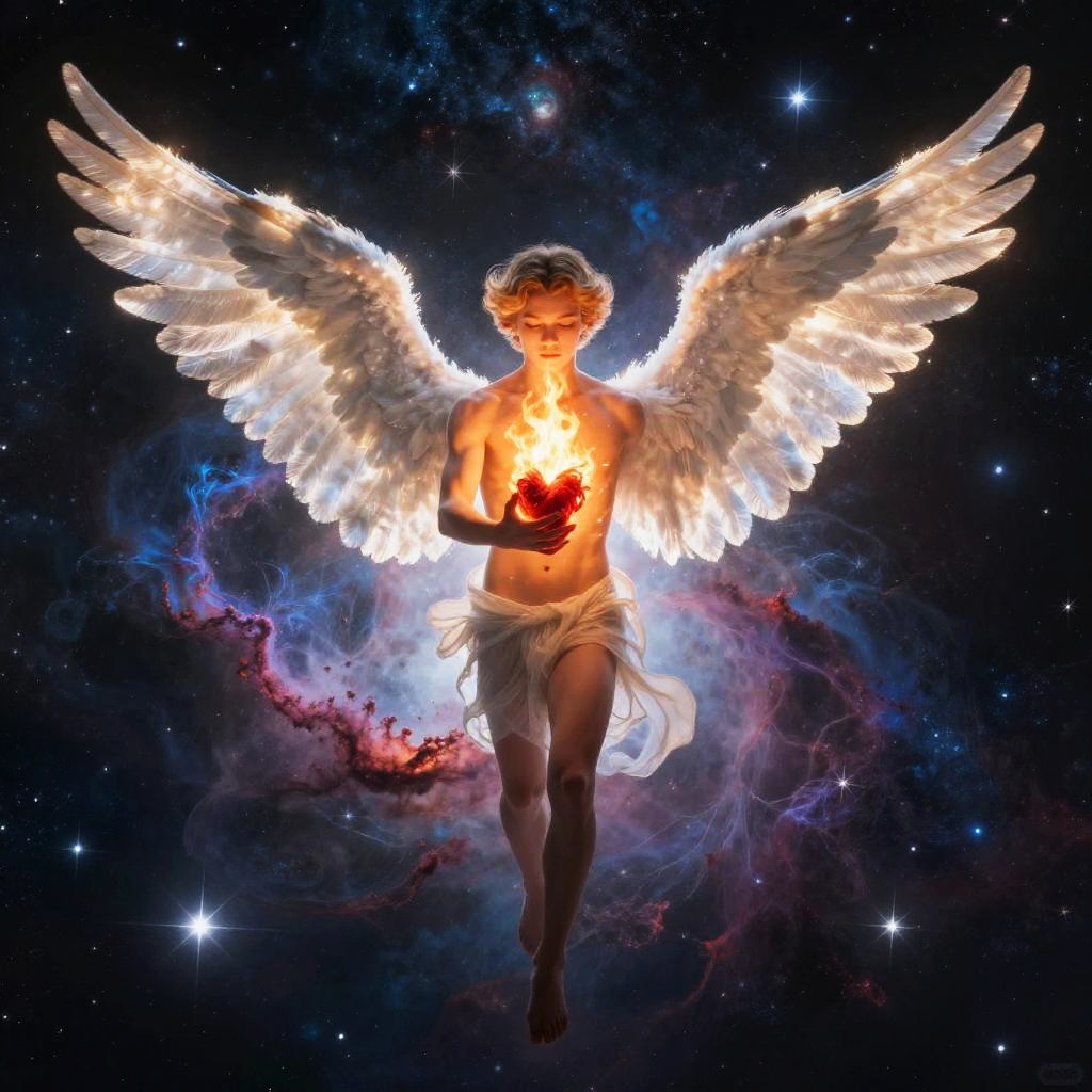 Himeros god portrayed as a youthful figure with wings of light, carrying a flaming heart, set against a cosmic night sky filled with stars and nebulae, surreal and vibrant colors
