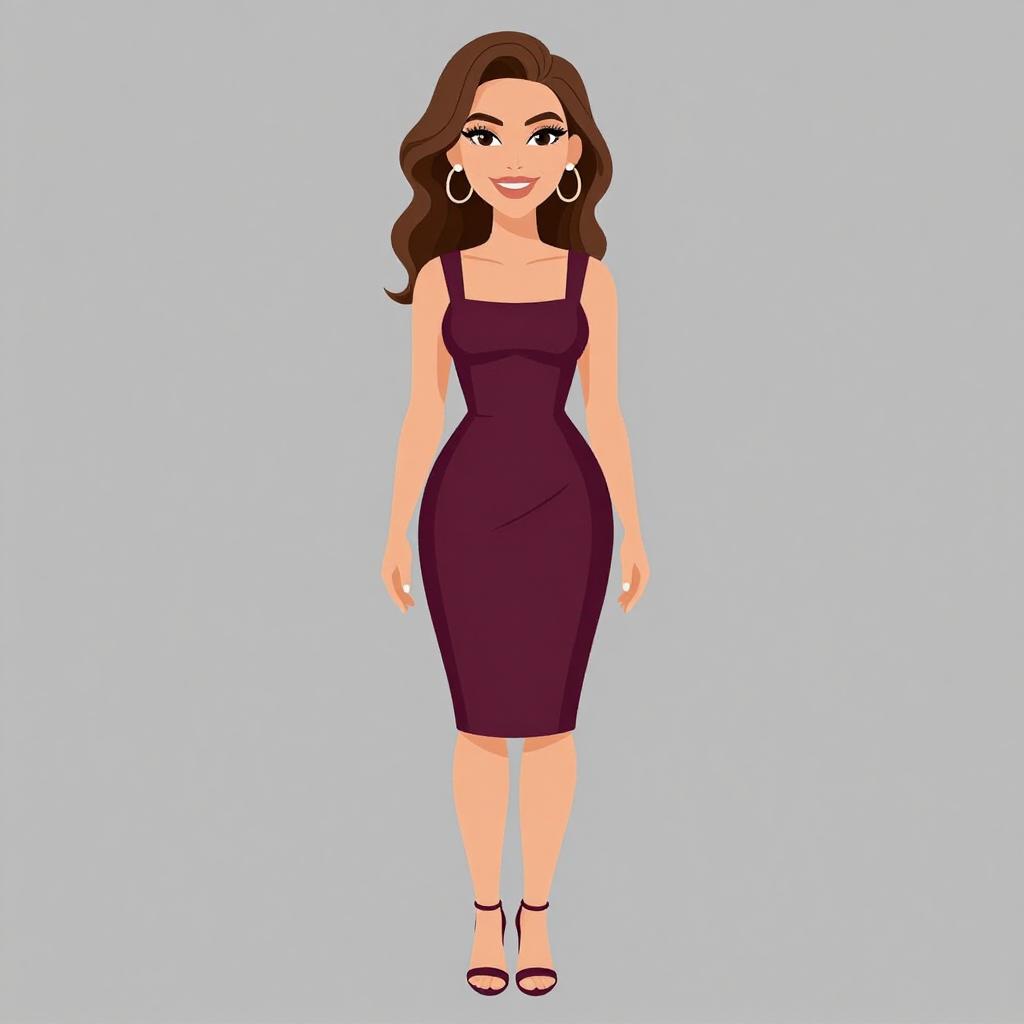 Digital illustration of a confident woman with long, wavy brown hair and olive skin standing against a solid dark gray background. She has large hoop earrings, subtle eye makeup, and a bright smile. She wears a white, sleeveless, deep V-neck top with black, high-waisted, knee-length pencil skirt adorned with tiny white dots. Black strappy high heels complete her outfit. Her right wrist sports a white bracelet, and her left hand rests casually by her side. The illustration style is clean and modern with bold colors and smooth lines.