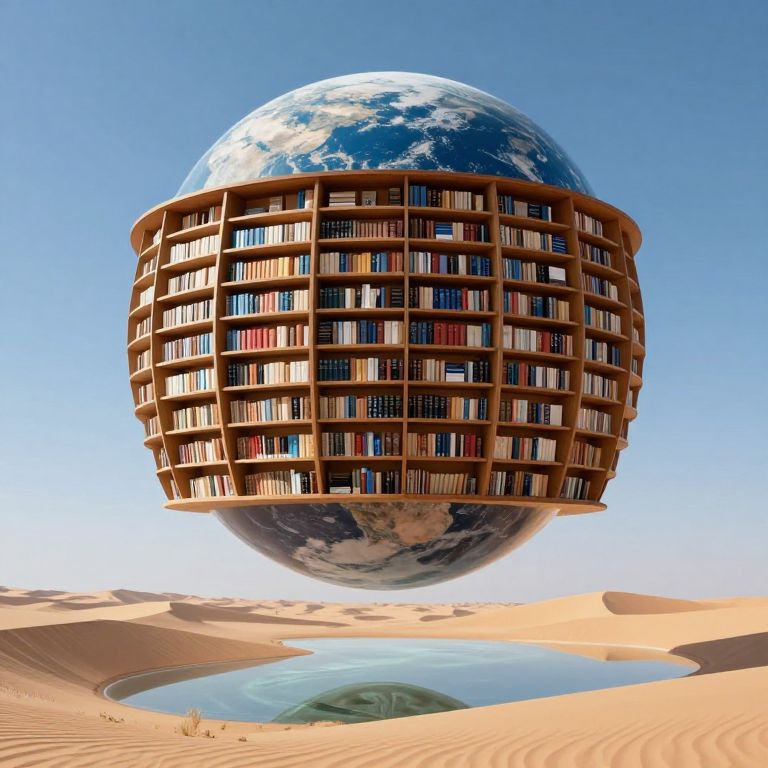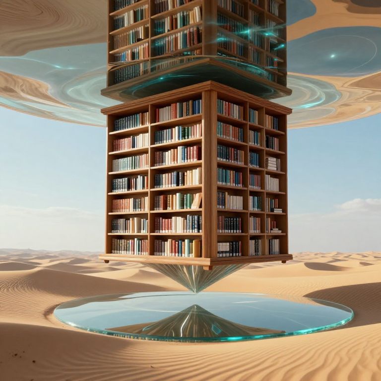 Surreal architecture of a multi-tiered, gravity-defying library floats above a mirrored desert landscape, where rippling sand dunes transform into liquid glass reflections of the azure sky.