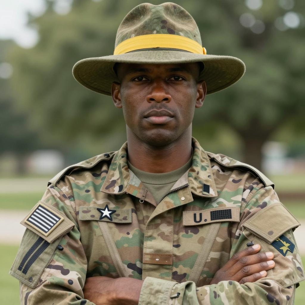 A dark-skinned man in military camouflage uniform with a green shirt underneath. He wears a green, wide-brimmed hat with a yellow band. His arms are crossed, and he has a serious expression. Background includes lush green trees. "U.S. Army" is visible on his chest. The man has a small star-shaped patch on his left chest.
