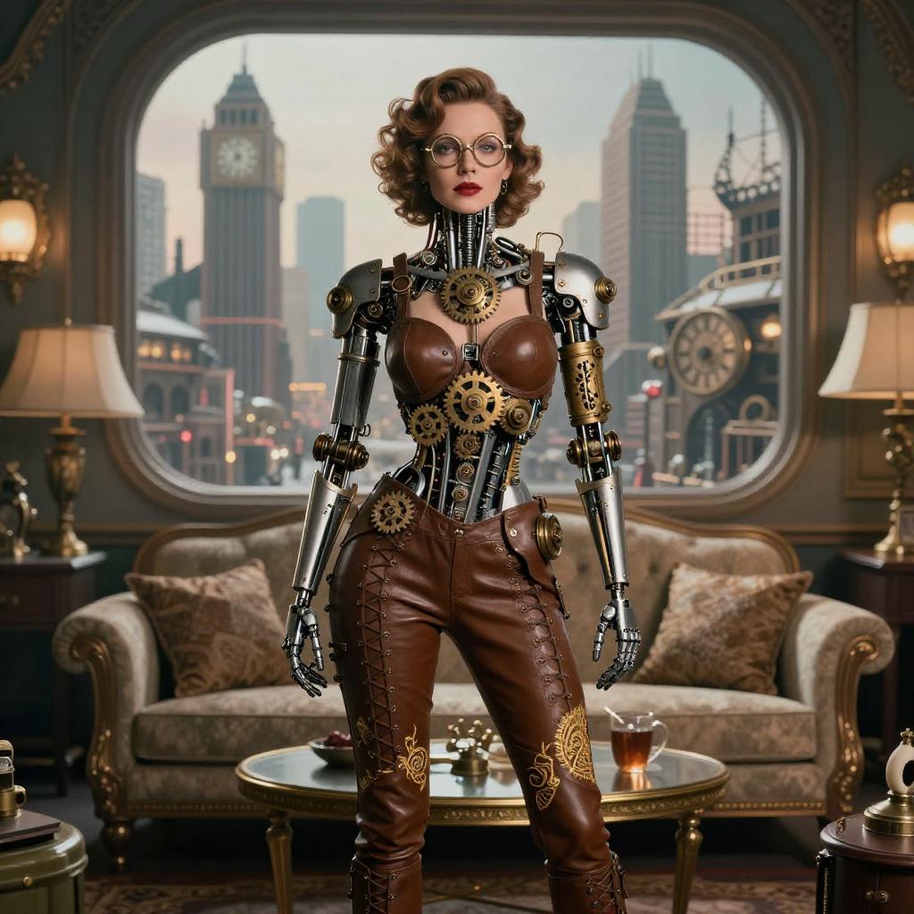 Realistic photo.M.C. Escher-inspired scene of a monochrome bronze robot woman with feathers and crystals in her head, standing in an infinite red desert under a twilight sky with a full moon, surreal and dreamlike atmosphere realistic photo