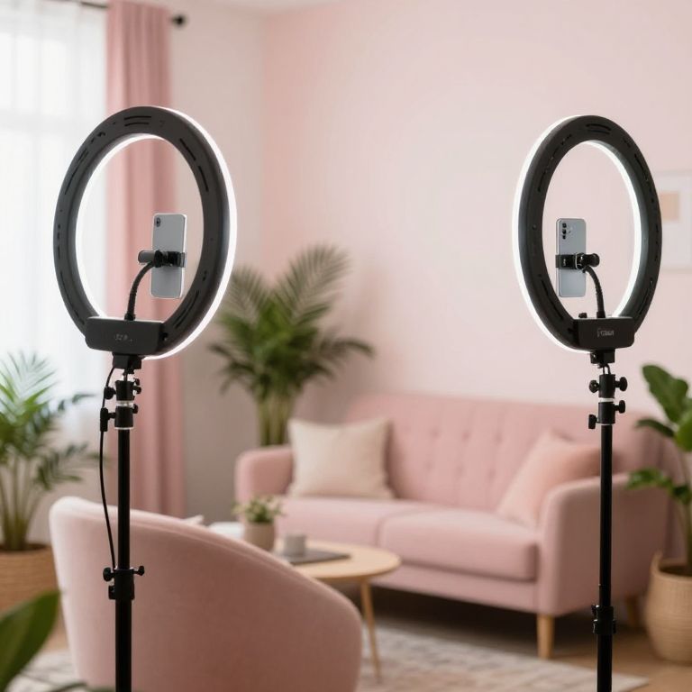 Photograph of two ring lights with smartphones attached, positioned in a pastel pink living room with potted plants and a pink sofa.