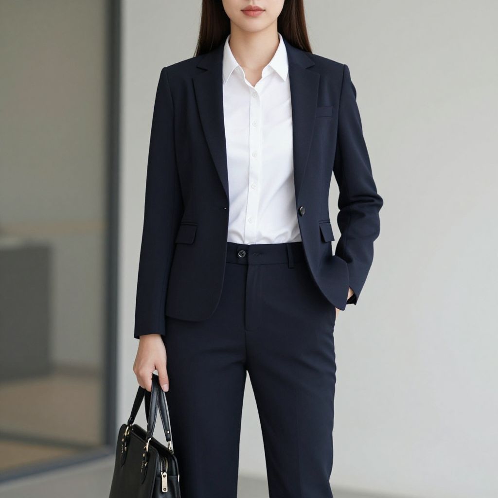 Photograph of an Asian woman with long black hair, wearing a black blazer over a white button-down shirt, paired with black trousers. She holds a black leather handbag in her left hand. Her right hand is in her blazer pocket. The background is a minimalist, modern indoor setting with a blurred white and gray wall. The woman's face is partially visible, with a neutral expression. The overall style is professional and sophisticated, emphasizing business attire.