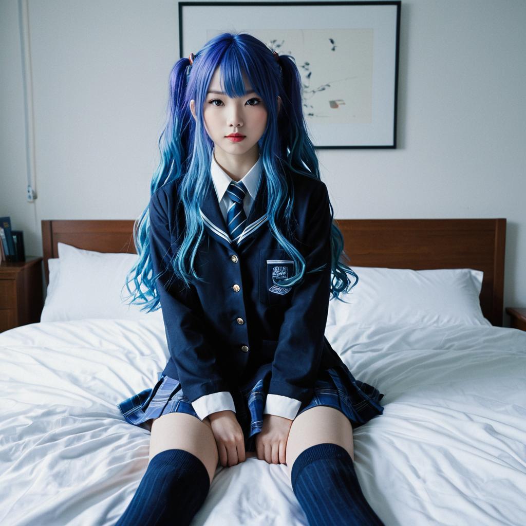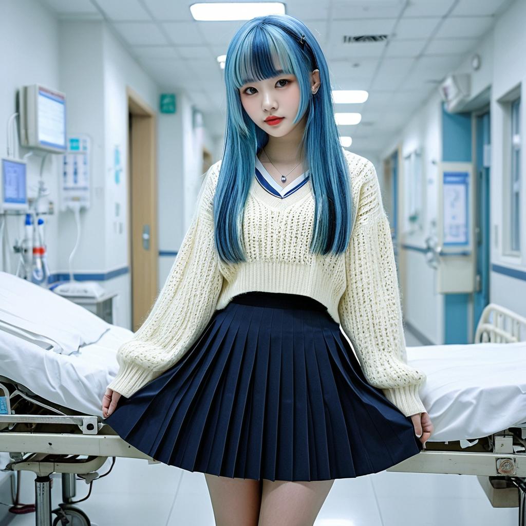 1girl, casual open-chest sweater pleated skirt accessory loafers, blue hair, medium hair, blunt bangs bangs, chinese in hospital evening