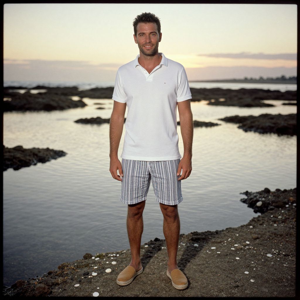 A man, white polo shirt, striped seersucker shorts, tan espadrilles, coastal style, sunset glow, tide pools glistening, scattered seashells, calotype process, relaxed smile. Man has masculine face and piercing eyes
