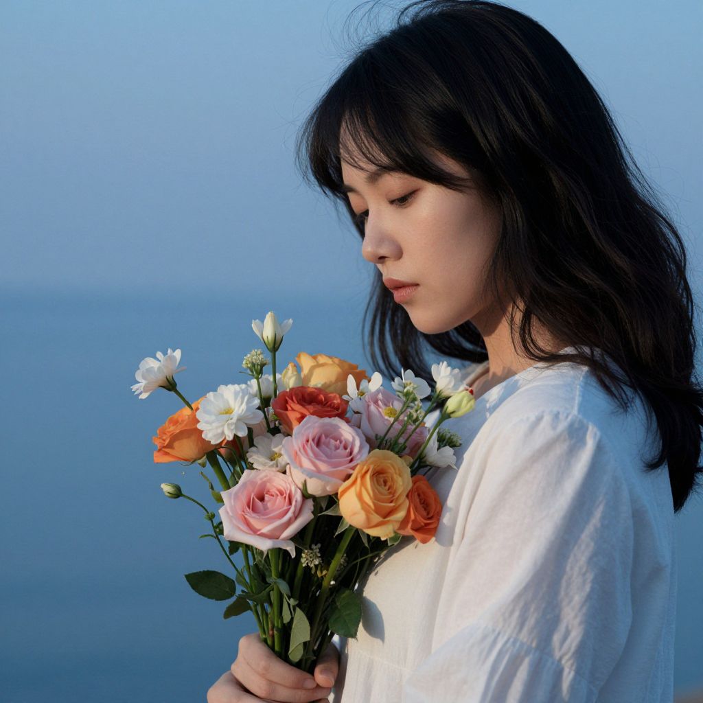 Amidst a serene blue backdrop, a woman cradles a vibrant bouquet of flowers, embodying a delicate balance of beauty and introspection, where the ephemeral nature of blossoms mirrors the transient yet enduring essence of human emotion.