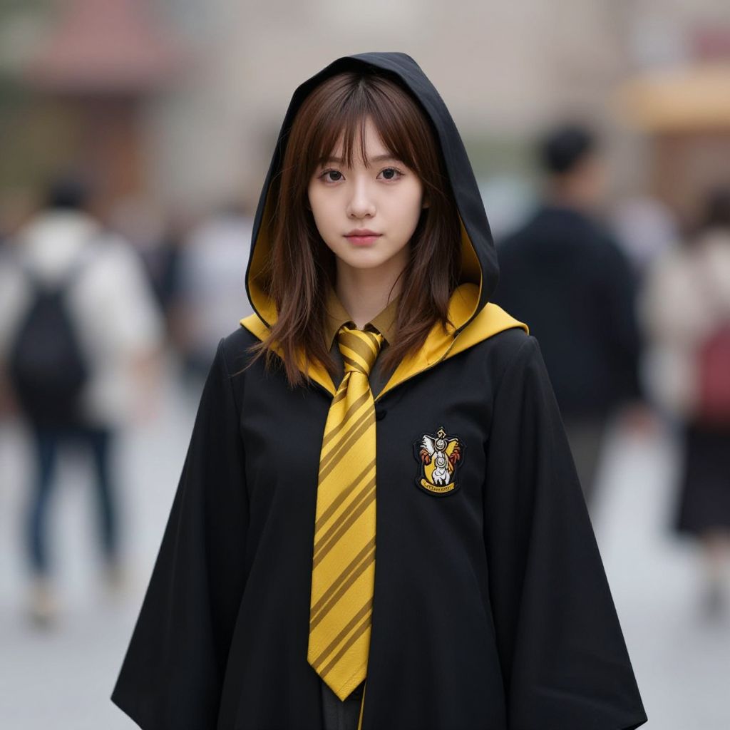 Young Asian woman with fair skin, brown hair, wearing a black Hogwarts-style robe with yellow hood and striped tie, standing in a blurred, crowded urban