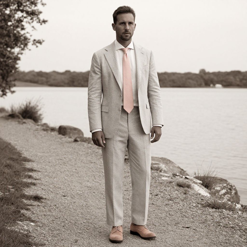 A man, light gray seersucker suit, white linen shirt, pastel pink tie, tan suede derby shoes, relaxed modern fit, serene lakeside trail, sepia effect, thoughtful expression Man has masculine face and piercing eyes