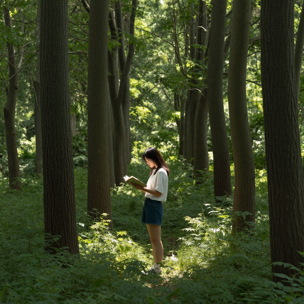 A young woman stands amidst a serene forest, surrounded by towering trees and lush greenery, while reading a book illuminated by dappled sunlight filtering through the canopy.