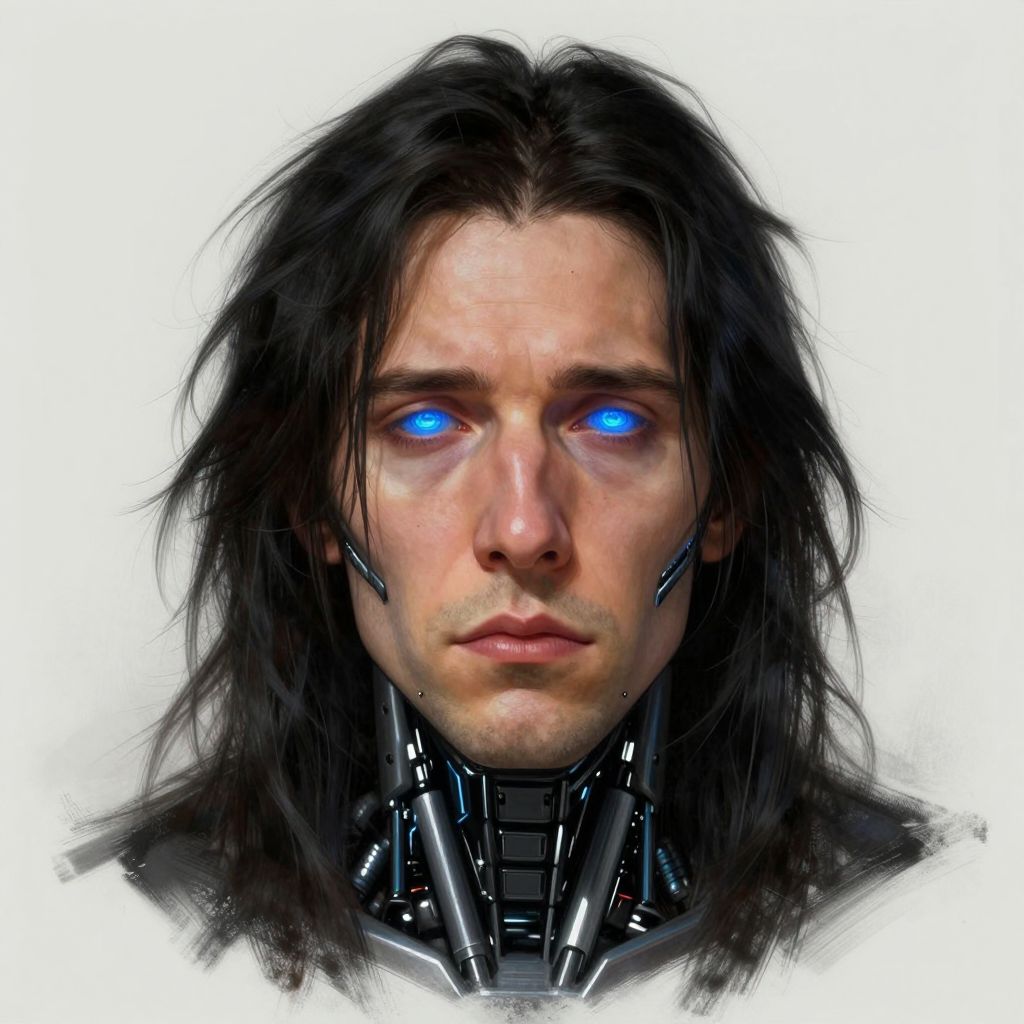 Portrait of a man by greg rutkowski, symmetrical face, he is about 30 years old, messy long black hair, tired appearance, roman nose, he has become some sort of biomechanical transhuman god with eyes that glow electric blue, peaceful but sad expression, highly detailed portrait, digital painting, artstation, concept art, smooth, sharp foccus ilustration, artstation hq.
