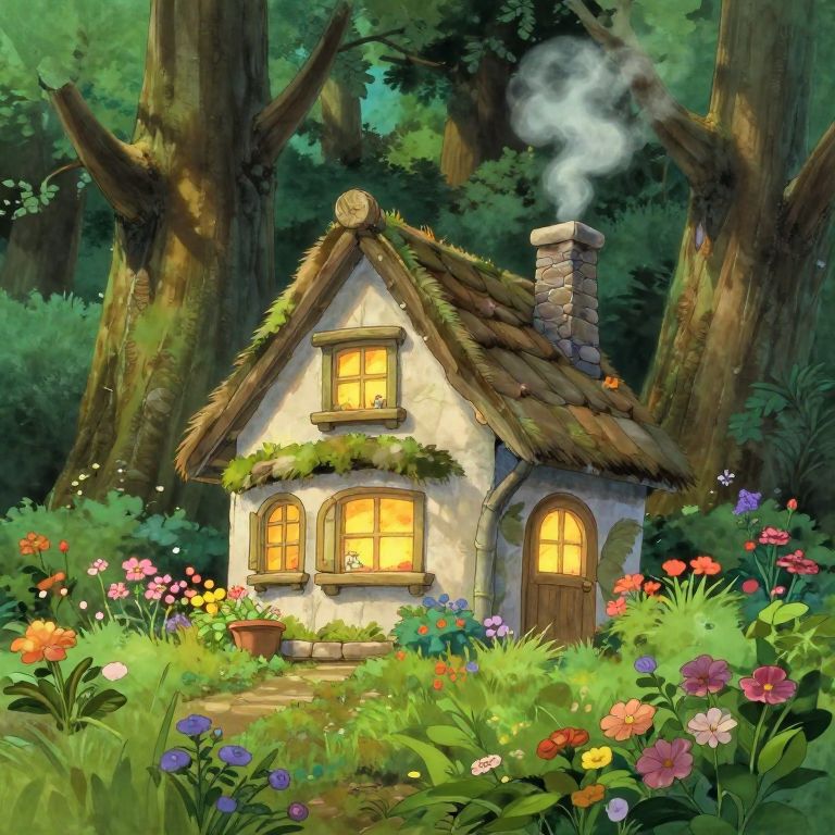 Studio Ghibli cottage nestled in a lush enchanted forest, warm glowing windows, surrounded by vibrant flowers and towering ancient trees, whimsical smoke rising from a stone chimney, soft pastel colors, magical atmosphere, detailed hand-drawn style.