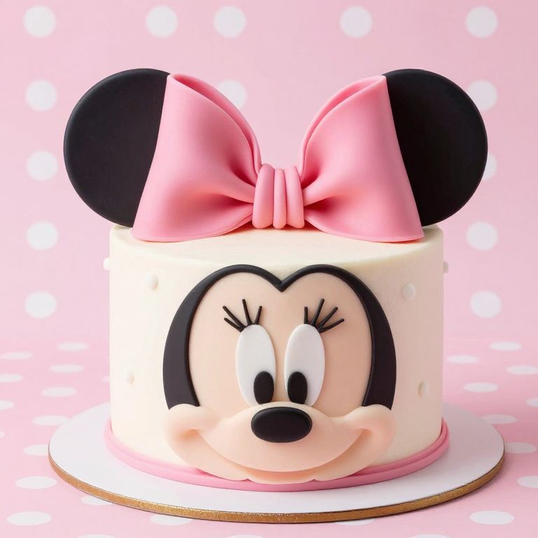 Cute Hot Air Balloon Cake by Mina Bakalova features a pastel pink base adorned with white cloud decorations and pink floral accents, topped with a charming yellow-and-white striped balloon basket containing a panda figurine, all presented on a wooden surface.