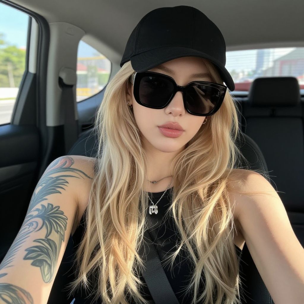 Photograph of a young woman with long, wavy blonde hair wearing a black cap and oversized black sunglasses. She's sporting sleeve tattoos on her right arm, featuring detailed designs. She's dressed in a black top and sitting in a car with sunlight streaming in through the windows. Her expression is relaxed, and she's touching her hair with her right hand. The background is blurred, emphasizing her as the focal point.