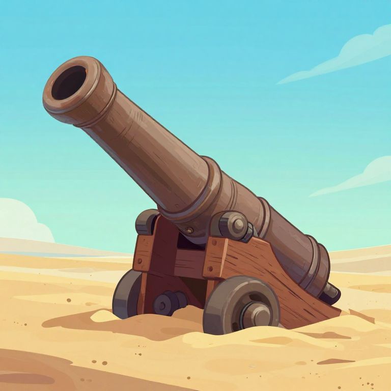 Digital illustration of a large, wooden-wheeled cannon with a long barrel, positioned in a sandy desert under a bright blue sky.