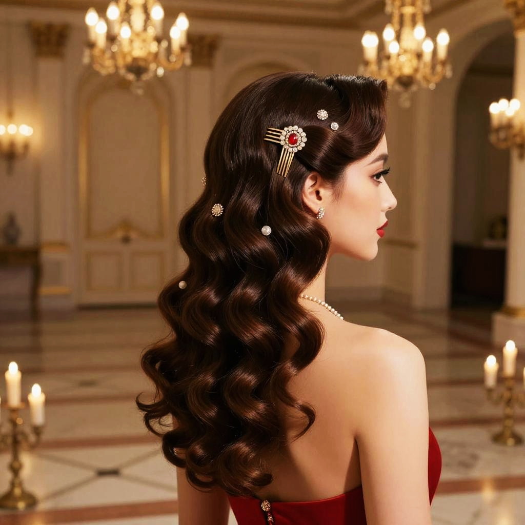 Red dress hairstyles combining vintage finger waves and jeweled hair combs, styled for an elegant evening gala with chandeliers and marble floors, glowing candlelight creating a glamorous and timeless atmosphere