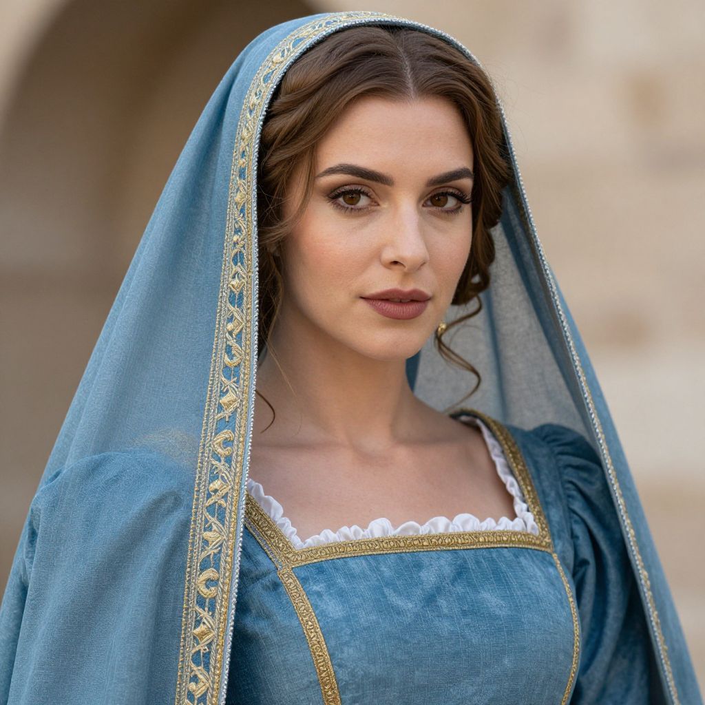 Photograph of a young woman with fair skin and dark brown, wavy hair partially covered by a blue, medieval-style veil adorned with gold embroidery. She has dark brown eyes, softly arched eyebrows, and wears muted burgundy lipstick. Her blue dress has a square neckline with white lace trim and gold borders. She wears a gold hoop earring in her right ear. The background is blurred, featuring a beige stone archway, suggesting an outdoor historical or medieval setting. The image has a soft, natural light highlighting her serene expression and delicate features.