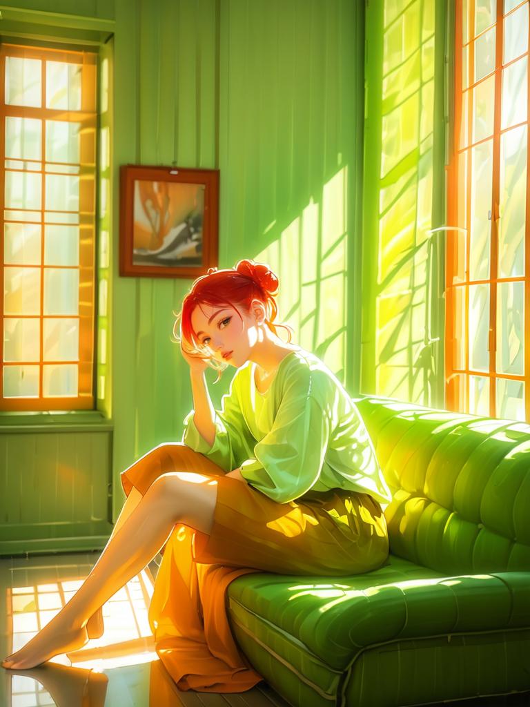 A relaxed young woman with red hair tied up in a loose bun reclines casually on a green sofa in an indoor setting. Warm sunlight streams through large windows, casting soft shadows and creating a cozy, serene atmosphere. The image features warm orange and green color tones with a painterly style, highlighting the woman's casual pose and thoughtful expression.