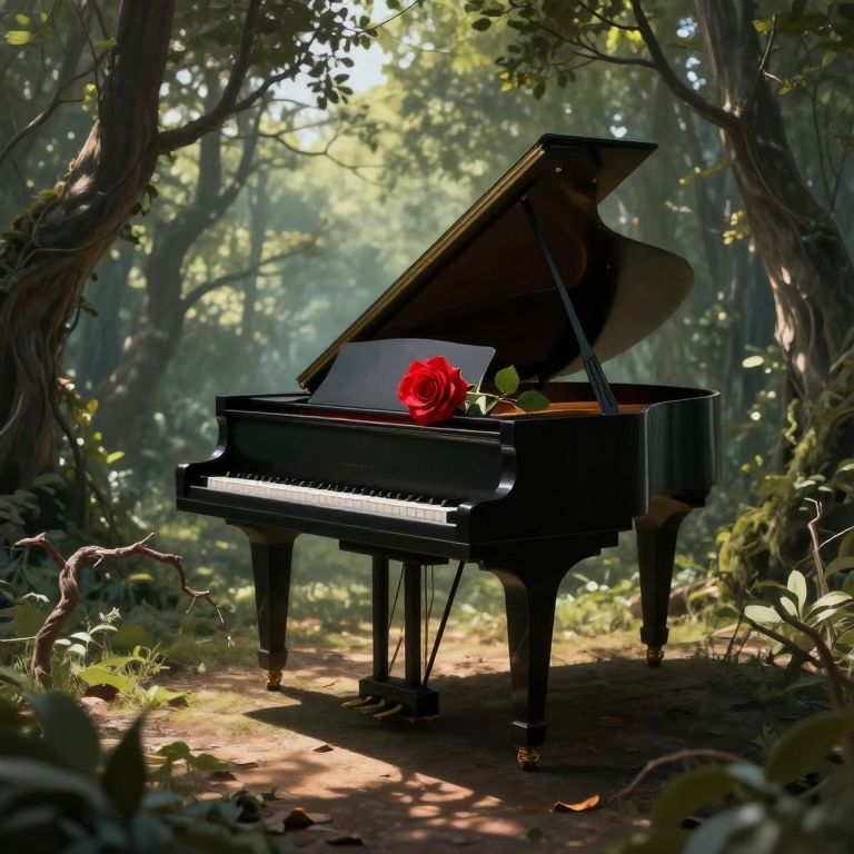 A grand piano suspended in mid-air dominates this surreal landscape, its intricate legs resembling twisted branches reaching towards an unseen horizon. Sunlight filters through the dense foliage surrounding it, casting dramatic shadows that enhance the eerie yet mesmerizing atmosphere. A single, vibrant red rose rests atop the keyboard, its soft luminescence adding to the dreamlike quality of this captivating scene, reminiscent of a surrealistic painting with a unique fusion of elements.