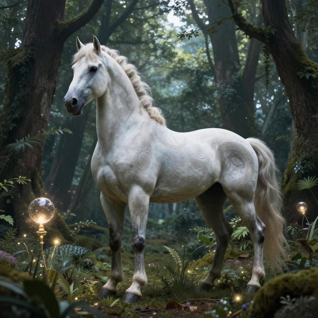 Real human horse hybrid depicted as a guardian of an enchanted forest, muscular human upper body with animalistic features, horse lower body adorned with mystical runes, surrounded by glowing flora and magical orbs, digital fantasy art.
